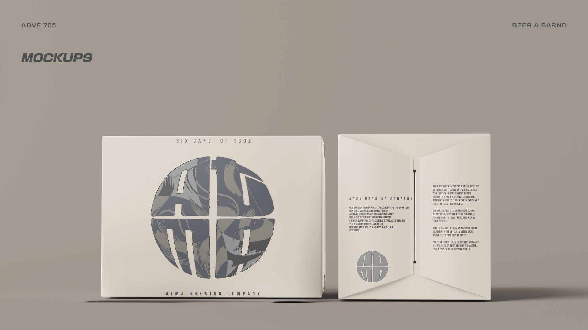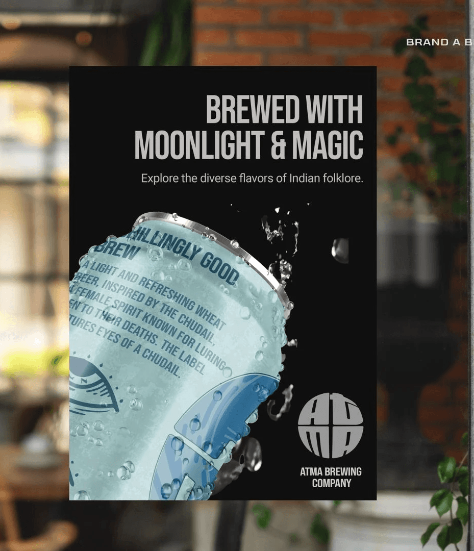 Atma Brewing Company is a brand inspired by India's diverse ghost folklore. Each beer variety draws inspiration from a mythical creature, offering a unique flavor experience and a touch of the otherworldly. Font Typeface: Fit Devanagari Variable, Bebas Neue